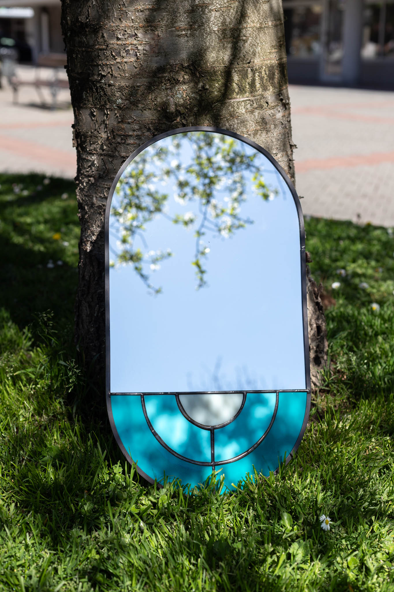 Its uniqueness lies in the use of the traditional Tiffany stained glass technique, renowned for precision and careful handcrafting. Each piece of opal glass is individually cut, polished, and joined, ensuring quality and design clarity. Consequently, no two mirrors are identical – each carries its own character, color depth, and play of light.