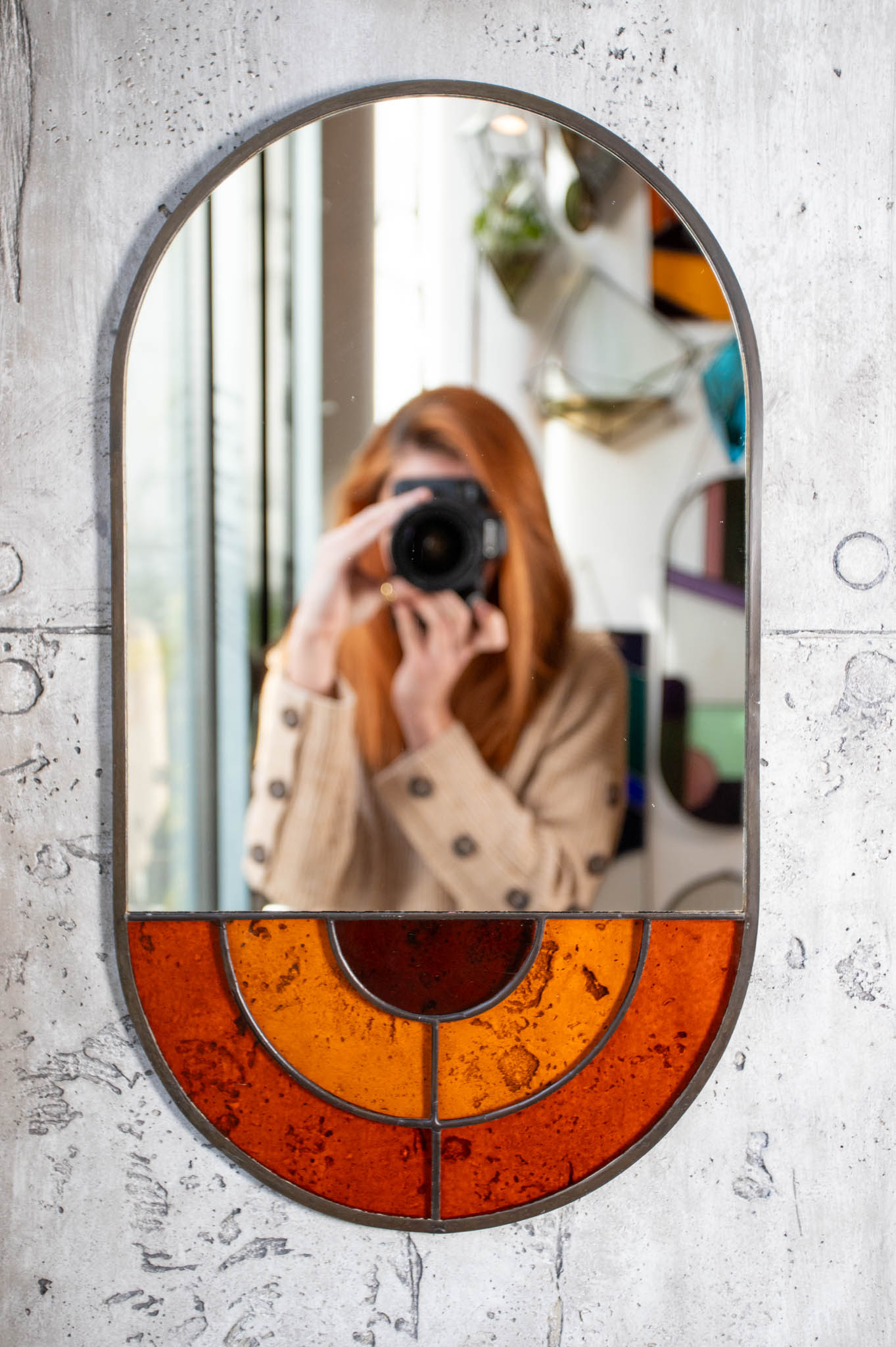 The “ROUND” hanging designer mirror is more than a practical element for your home – it is a unique object that combines function, craftsmanship, and artistic expression. With its elegant oval shape and golden stained glass detail, this hanging designer stained glass mirror becomes a striking visual centerpiece while remaining a harmonious addition to any interior.