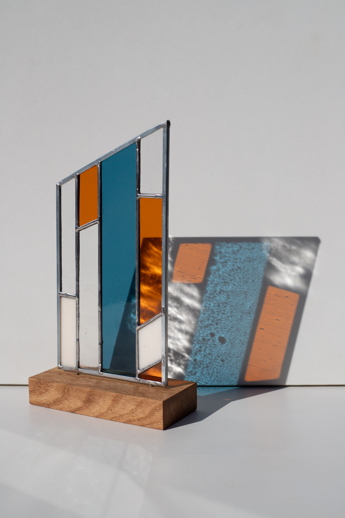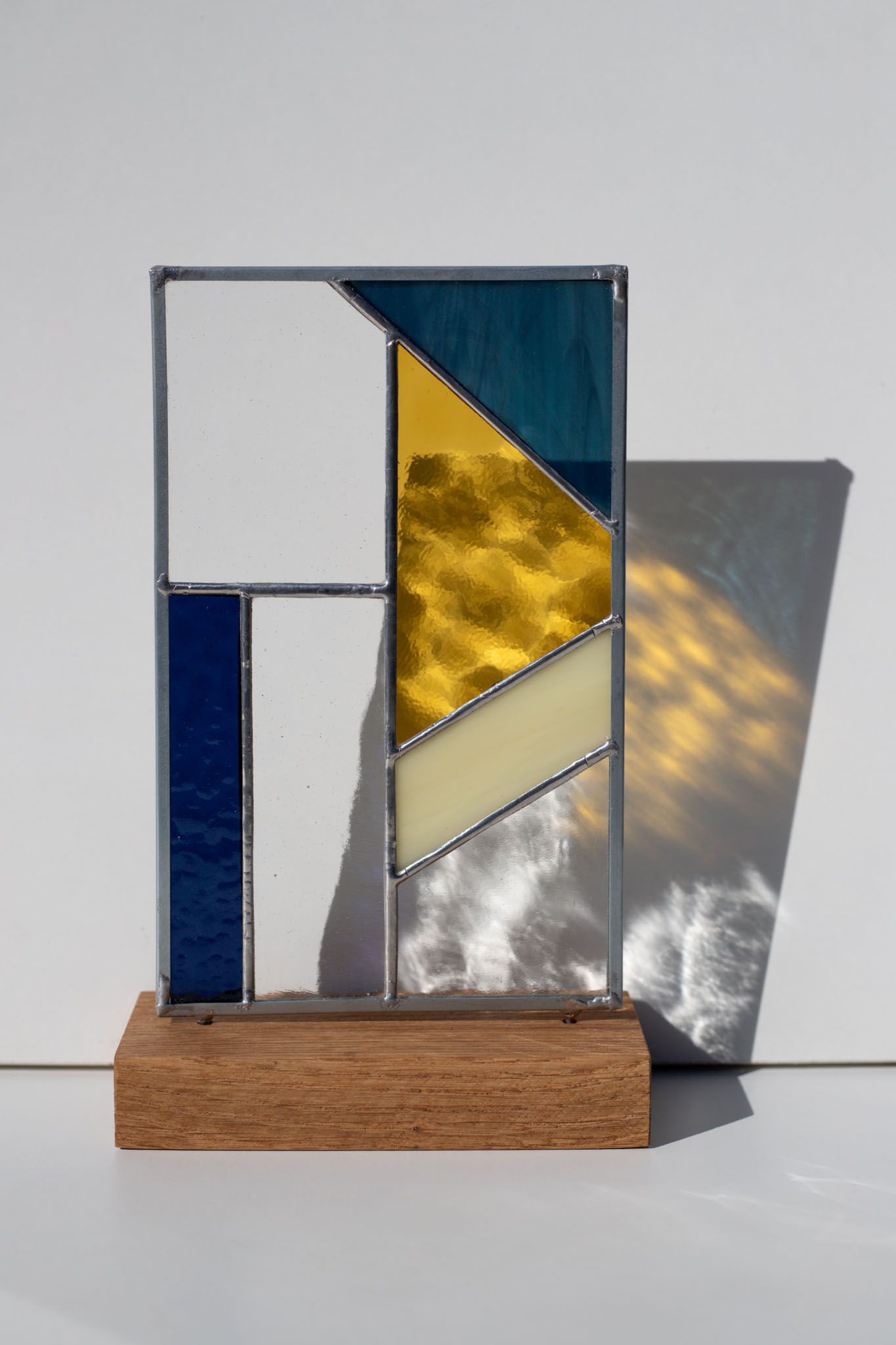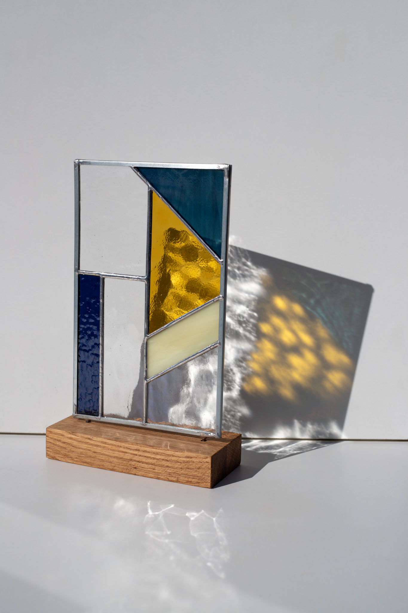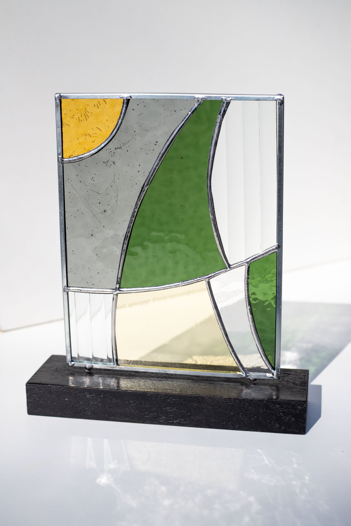 Bring a contemporary touch to your home with this handcrafted abstract stained glass sculpture. We created this unique piece for those who appreciate the interplay of light, texture, and modern geometry. It rests elegantly on any flat surface – from a sun-drenched windowsill to a professional office desk.