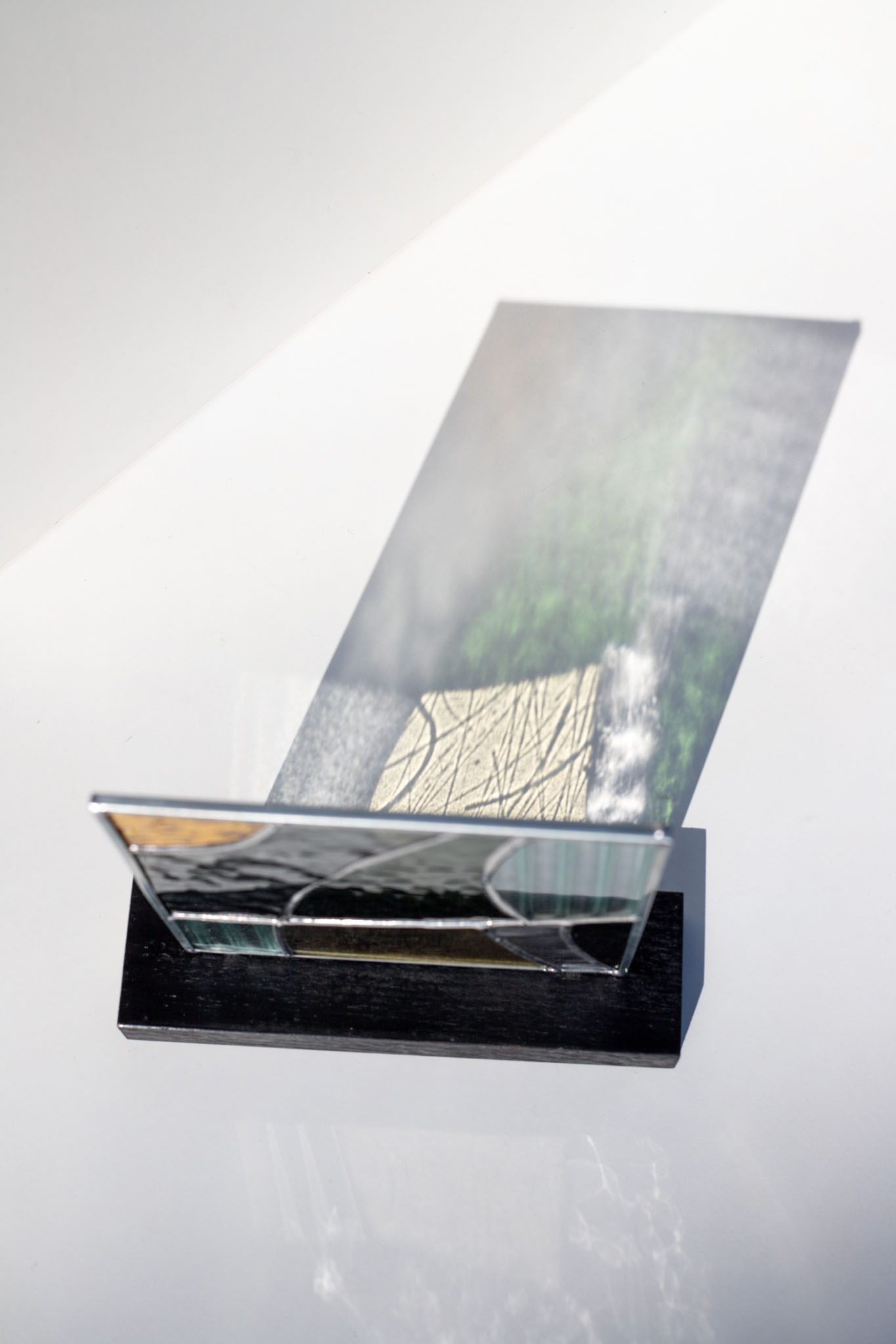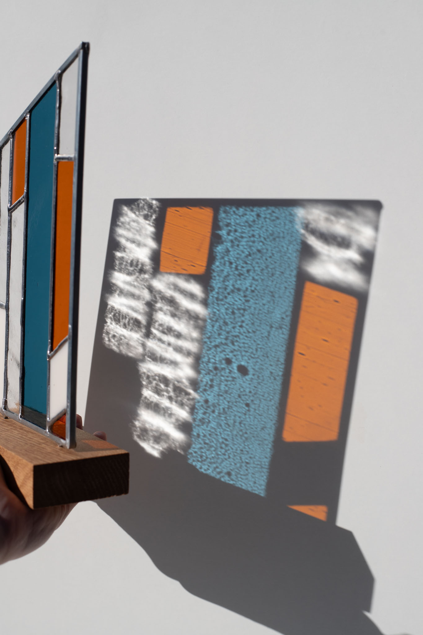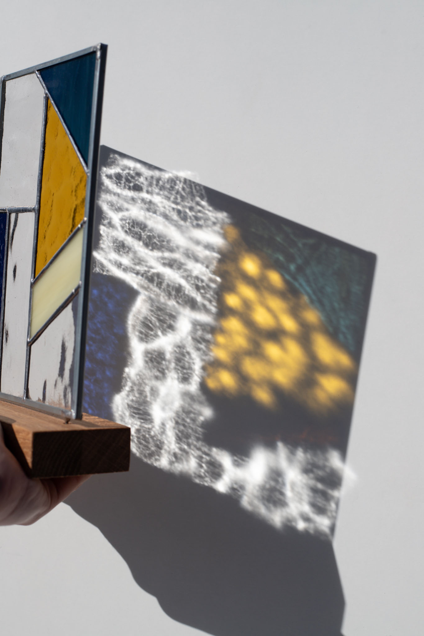 Abstract modern stained glass panel featuring textured and smooth glass elements, mounted on a minimalist wood block stand